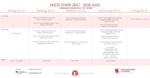 Ein rappelvolles und superspannendes Programm erwartet euch! Darunter fallen z.B. unser Empowerment-Workshop, unser Storytelling-Training, bei dem es um „Botschafter*in Sein geht, ein Diversity-Workshop und ein Handlungskompetenz-Training zum Thema „Engagement gegen Vorurteile“!